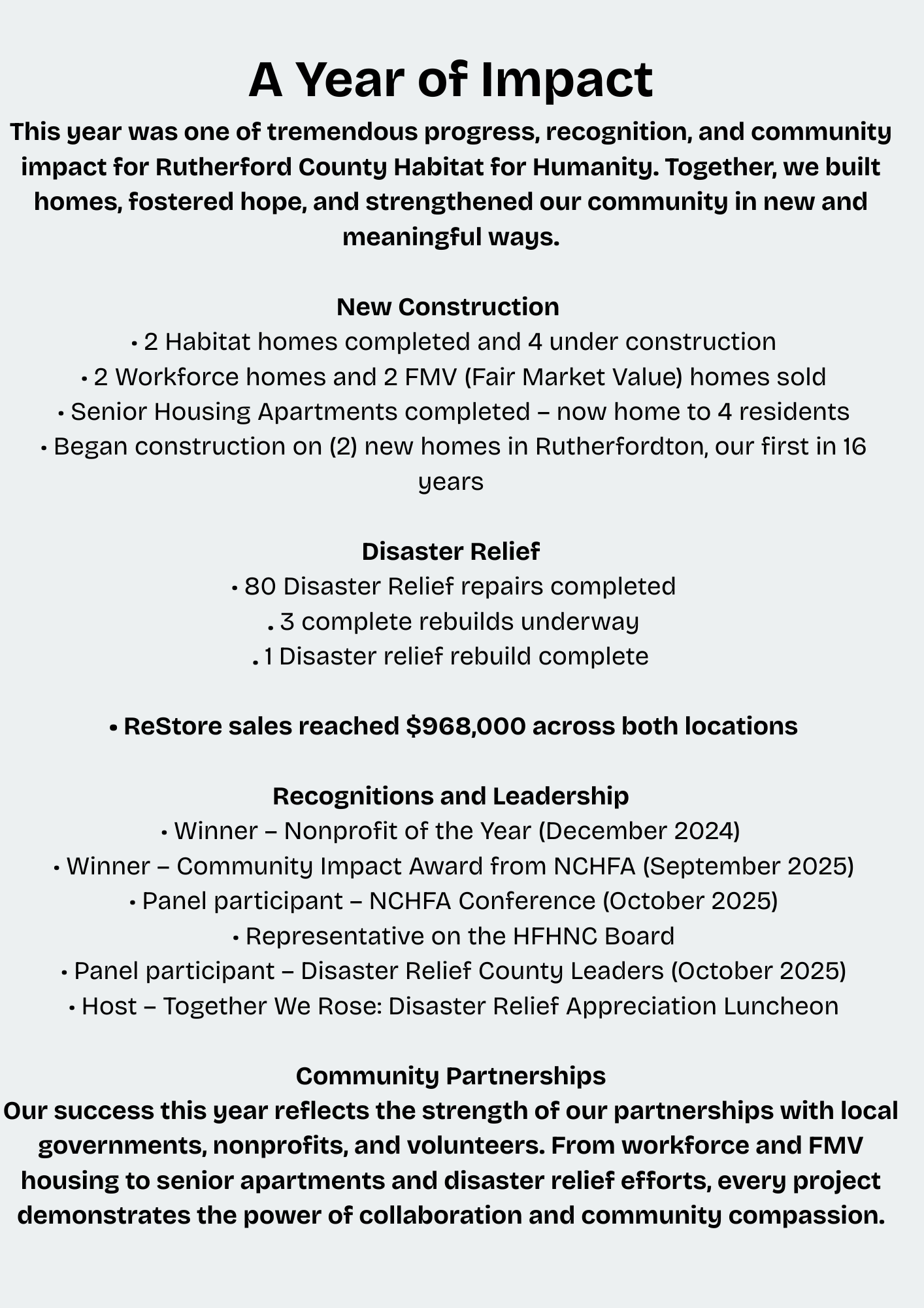 Rutherford County Habitat for Humanity is a 501(c)(3) organization. All donations are 100% tax deductible as a charitable gift for federal income tax purposes.